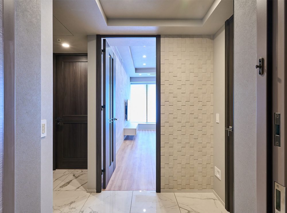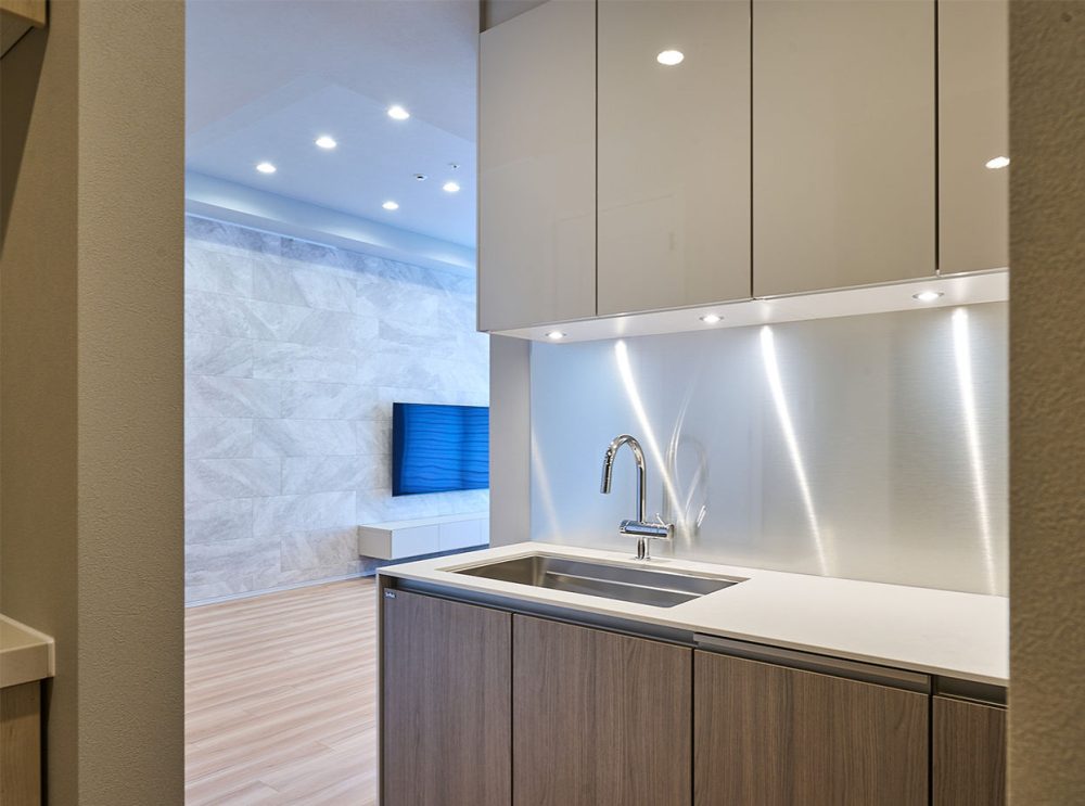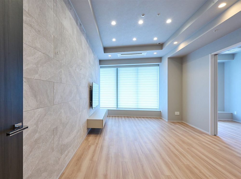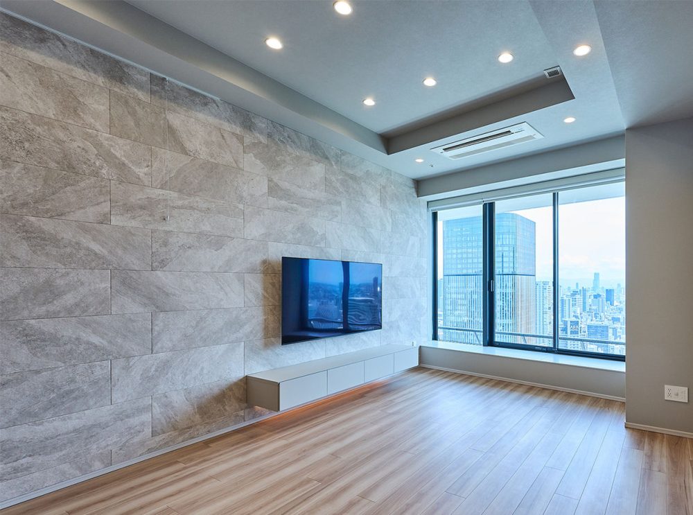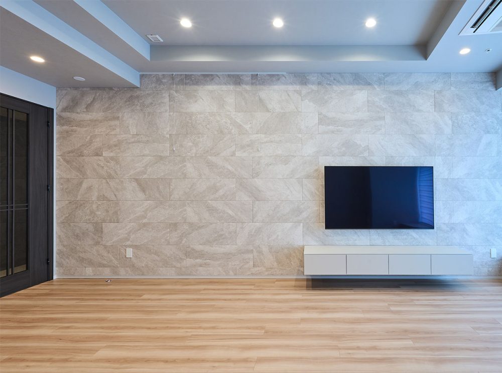 こちらのお部屋はもう一つのお部屋とは少し違った雰囲気の、シックなテイストのデザインでご提案させて頂きました。壁掛けテレビの背面は大判のタイルを施工する事でタワーマンションの雰囲気と相性◎。絵画等も飾れる様にレールを設置し、調光調色が出来る照明を設置する事で、気分に合わせて様々なお部屋の演出が可能。こちらのお部屋もお引越しが楽しみですね♪