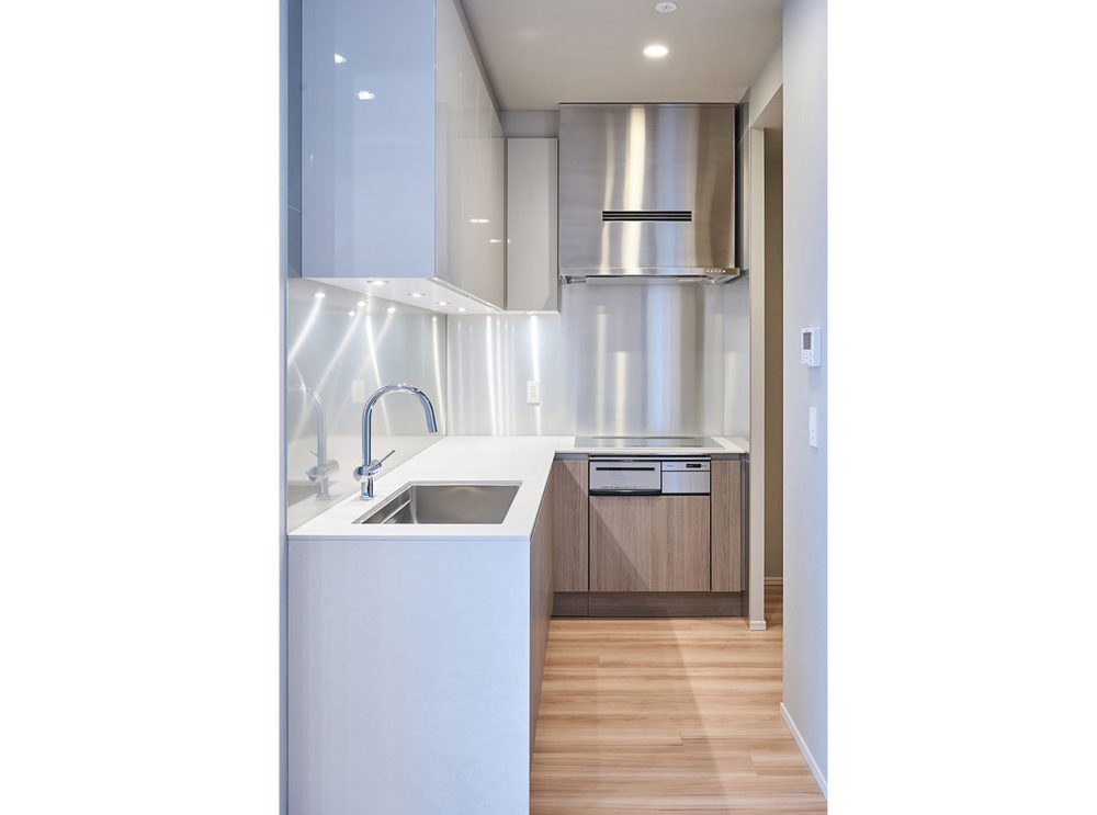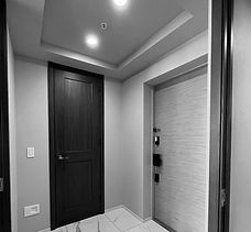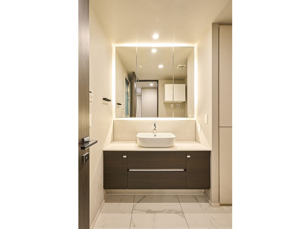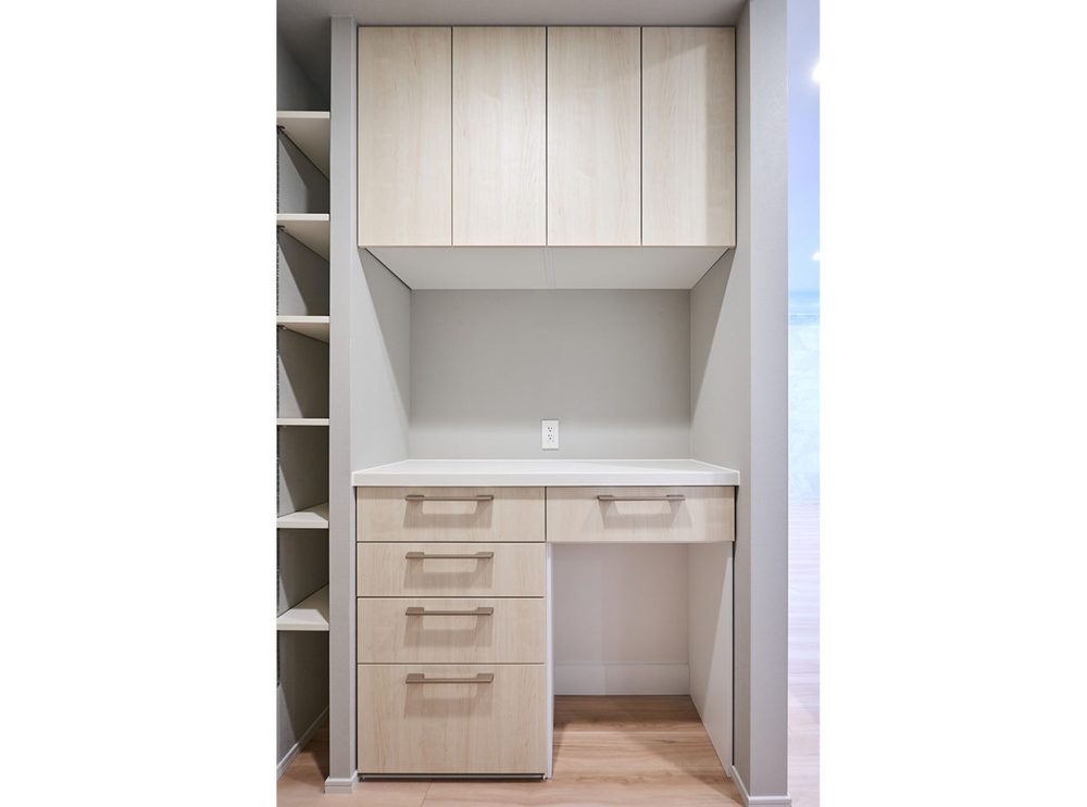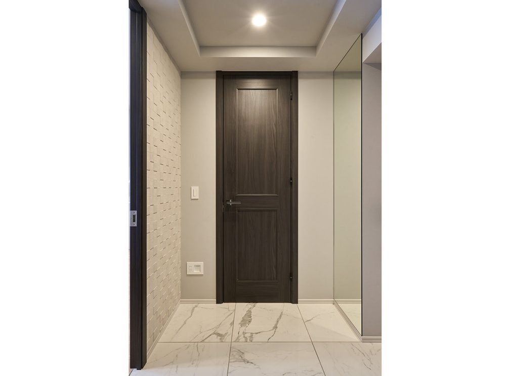 こちらのお部屋はもう一つのお部屋とは少し違った雰囲気の、シックなテイストのデザインでご提案させて頂きました。壁掛けテレビの背面は大判のタイルを施工する事でタワーマンションの雰囲気と相性◎。絵画等も飾れる様にレールを設置し、調光調色が出来る照明を設置する事で、気分に合わせて様々なお部屋の演出が可能。こちらのお部屋もお引越しが楽しみですね♪